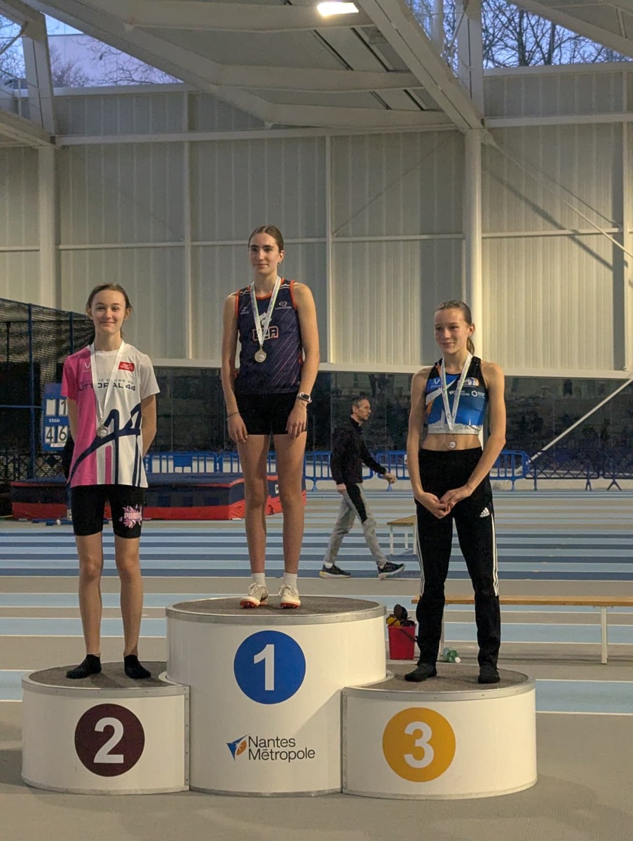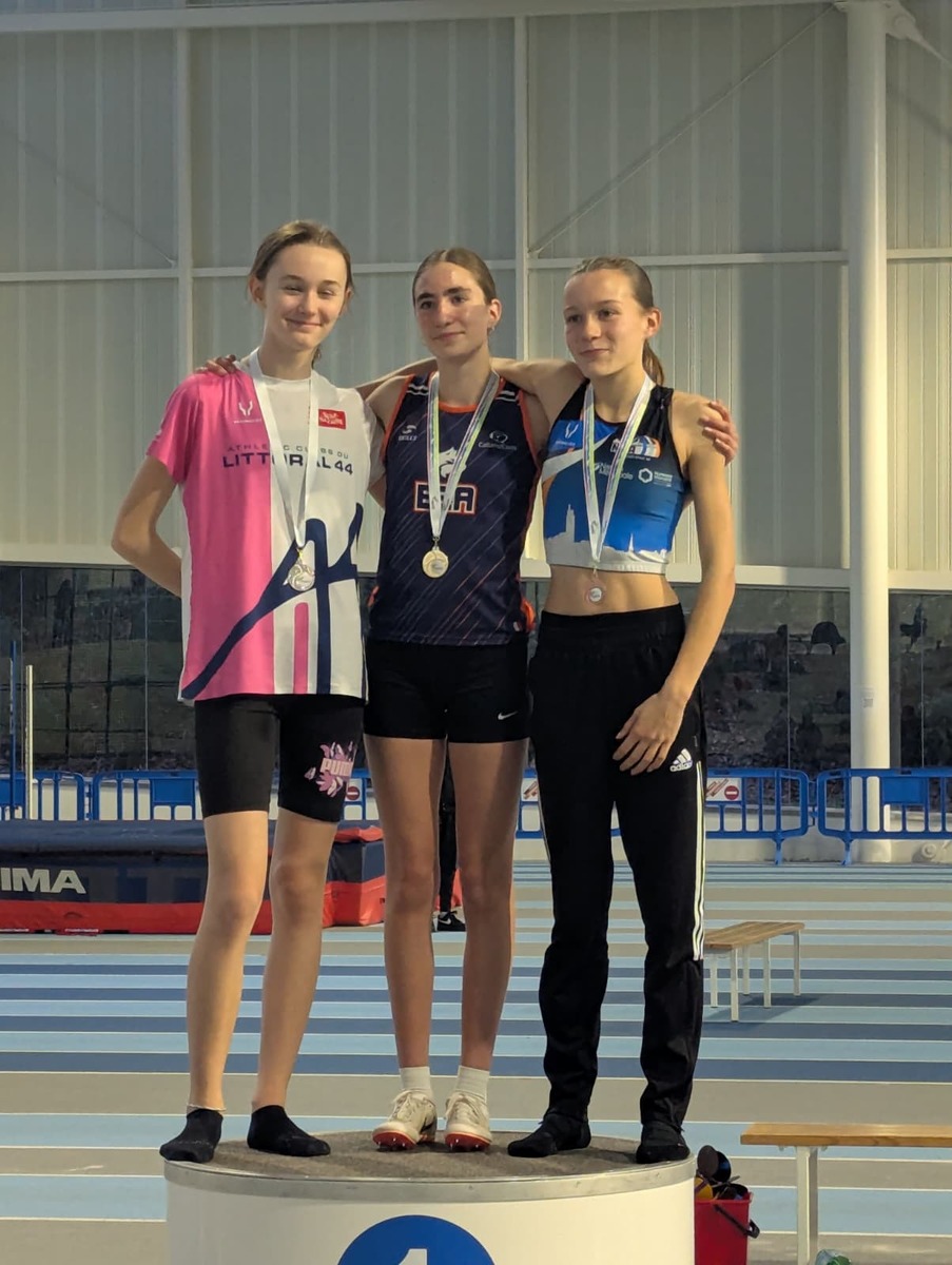 Clarisse TOURNAILLE remporte la médaille de bronze avec une belle 3ème place chez les Minimes F ! Elle bat son Record Personnel en accumulant 2585 points à l'issu de ses 5 épreuves : longueur (4m14), 50mhaies (8''40), poids (8m02), hauteur (1m21) et 1000m (3'09).